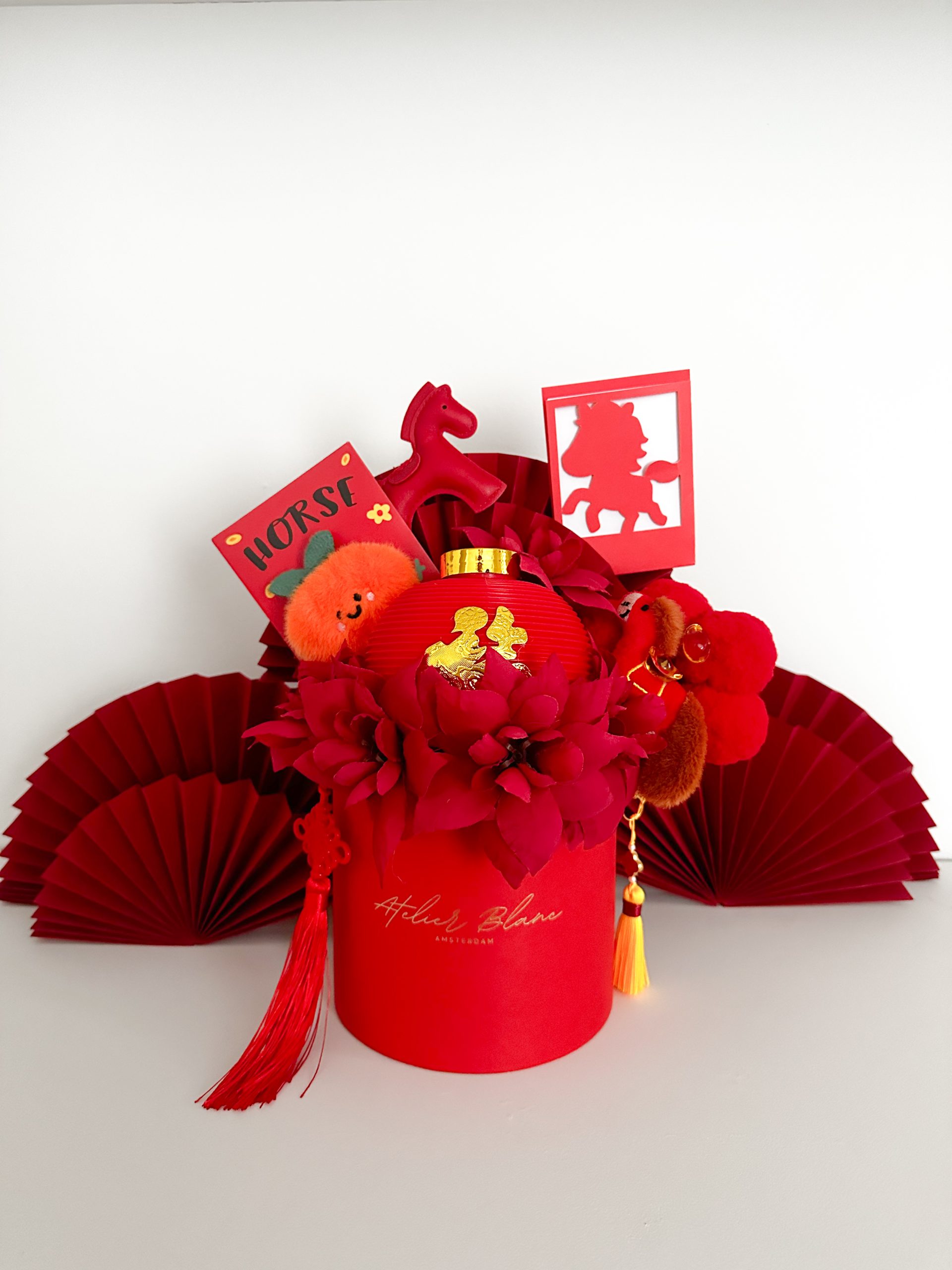 Wish your loved one, family, or friends a happy, healthy, and loving year with a personalized Flower Box! A beautiful box filled with red flowers, a lantern, and various options to make it special. The box is finished with a horse-printed envelope, inside which you'll find a card for your personal message.
