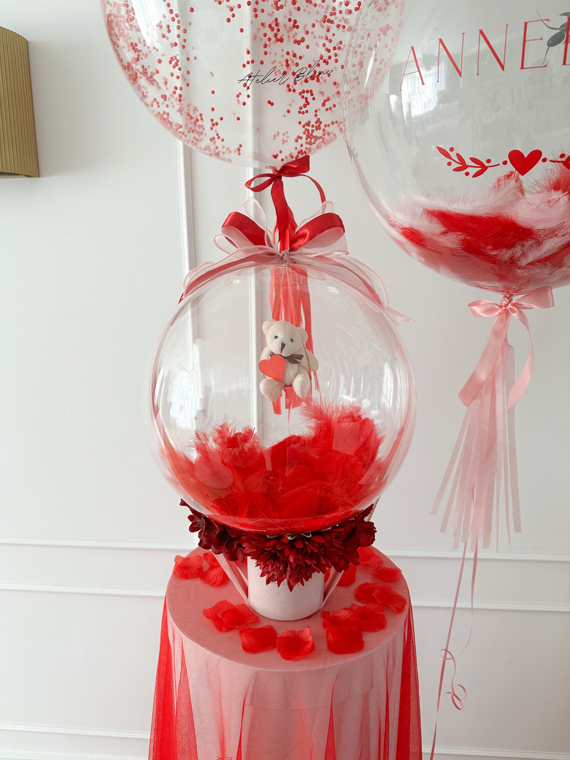 A beautiful balloon featuring a bear and heart on a swing. Feathers are placed beneath the bear. The balloon is placed in the middle of the flowers. Personalize to your heart's content, or choose "Atelier Blanc decides" to leave it entirely up to us.