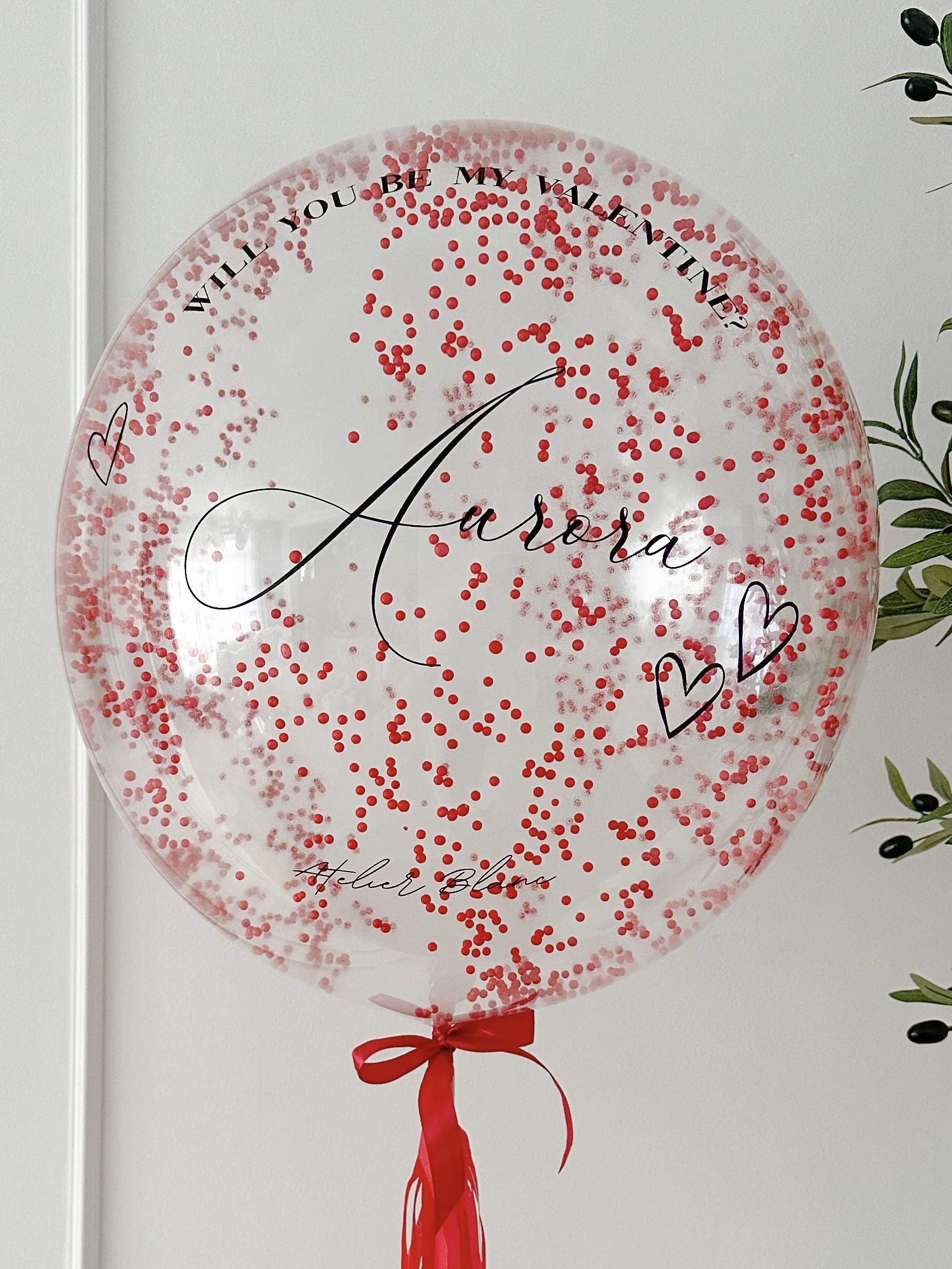 Een prachtige helium ballon gevuld met beads! De ballon wordt vastgemaakt aan een lange lint, afgemaakt met een satijnen strik en jouw persoonlijke tekst op de ballon.